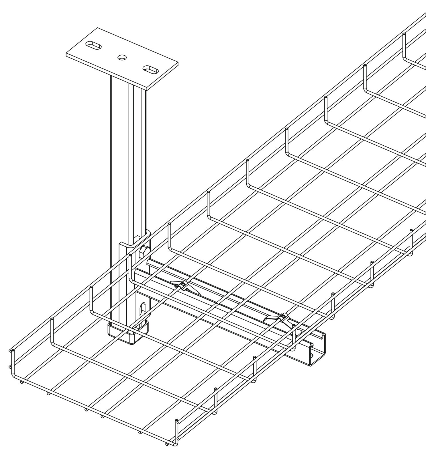 Dla korytek siatkowych o szerokościach do 300 mm stosować dwie klamry. Na każde 150 mm szerokości korytka - stosować jedną klamrę montażową.