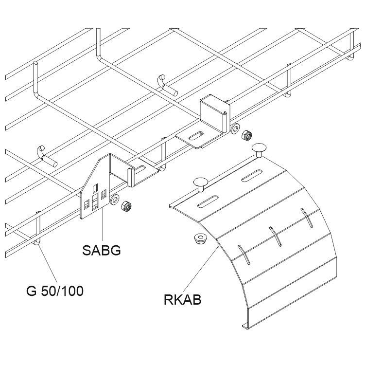 Uchwyt montażowy zejścia korytka siatkowego SABG umożliwia wykonanie płynnego zejścia kablowego z zachowaniem wymaganego kąta gięcia kabli, co wpływa na zmniejszenie naprężeń. Montaż odbywa się poprzez przykręcenie uchwytów do prętów bocznych korytka siatkowego. Rozstaw uchwytów należy dopasować odpowiednio do szerokości zejścia korytka RKAB. Produkt dostępny jest w różnorodnych wersjach zabezpieczeń antykorozyjnych, gwarantując jego zastosowanie w szerokim zakresie.