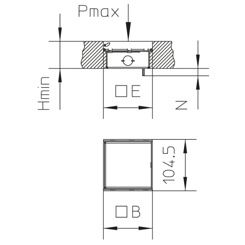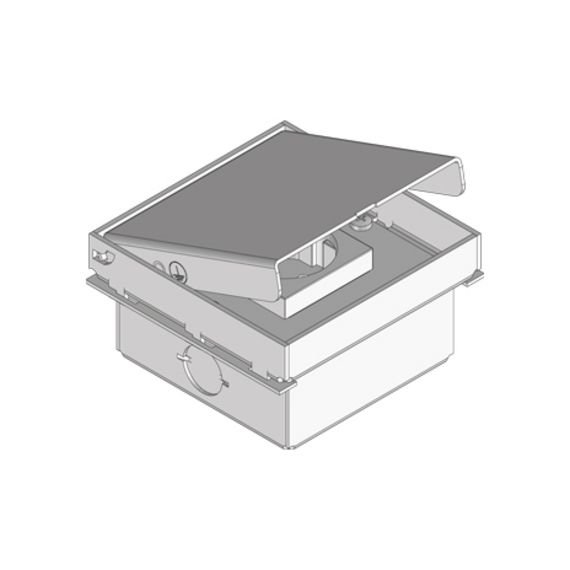 Kwadratowa kaseta zachowania czystości, uchylna, wykonana z wysokogatunkowej stali nierdzewnej. Kaseta fabrycznie wyposażona jest w jedno modułowe gniazdo zasilające (Schuko). Pokrywa płaska. Możliwość poziomowania za pomocą czterech śrub umieszczonych w podstawie. Po usunięciu pokrywy istnieje możliwość podłączenia wtyczki. Kaseta przeznaczona jest do instalacji bezpośrednio na chudziaku - łączona z jastrychem. Przystosowana do montażu w pomieszczeniach z podłogami czyszczonymi na sucho. Kaseta zaprojektowana do obciążeń biurowych.