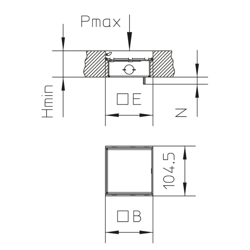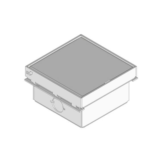 Kwadratowa kaseta zachowania czystości, wykonana z wysokogatunkowej stali nierdzewnej. Kaseta fabrycznie wyposażona jest w jedno modułowe gniazdo zasilające (Schuko) koloru białego. Pokrywa płaska, wypełniona piaskowaną stalą nierdzewną (R9). Możliwość poziomowania za pomocą czterech śrub umieszczonych w podstawie. Po usunięciu pokrywy wyposażonej w gumowe uszczelki istnieje możliwość podłączenia wtyczki. Kaseta przeznaczona jest do instalacji bezpośrednio na chudziaku - łączona z jastrychem. Przystosowana do montażu w pomieszczeniach z podłogami czyszczonymi na mokro. Kaseta zaprojektowana do obciążeń biurowych.