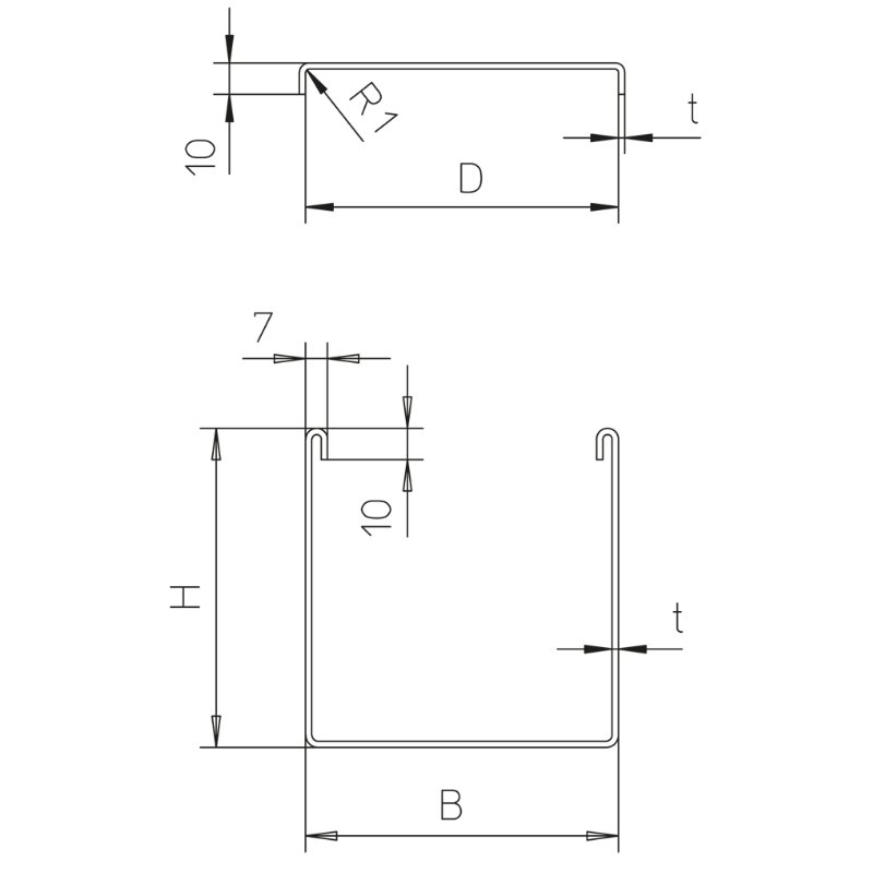 Mały kanał podłogowy bez perforacji, z pokrywą, z ryglem, wykonany ze stali ocynkowanej metodą Sendzimira zgodnie z DIN EN 10346, przeznaczony do prowadzenia pojedynczych kabli. Montaż do kanału głównego poprzez redukcję BKRKK.